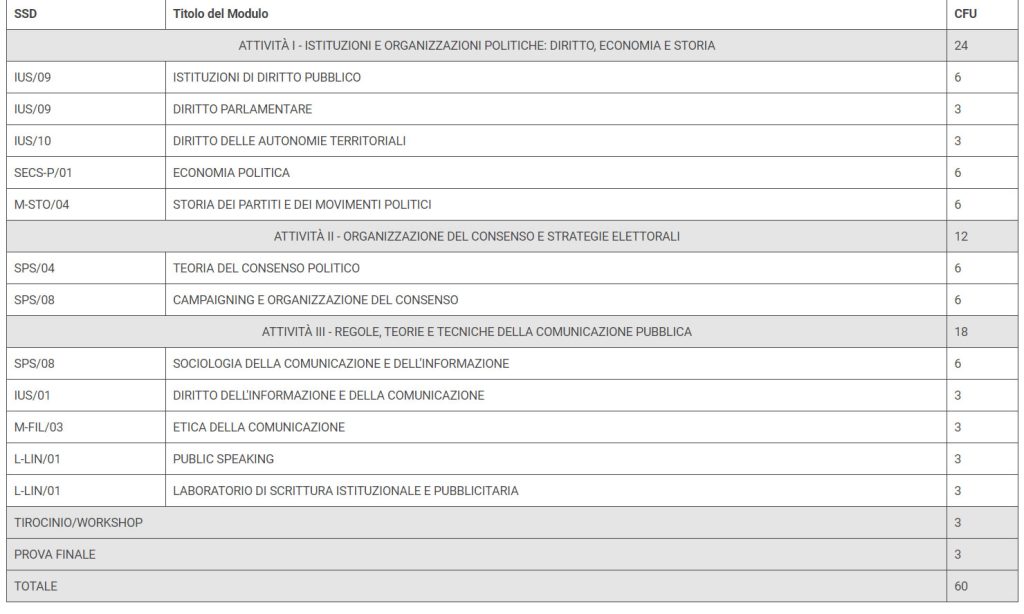 Il master si propone di fornire le competenze fondamentali della pratica legislativa e della comunicazione politica necessarie per formare adeguatamente un politico ed un operatore della politica, predisporre un progetto di Legge, elaborare un’idea-tema politico-identitaria, costruire una campagna elettorale vincente, parlare “con cognizione di causa tecnica” in pubblico senza esitazioni, redigere atti e discorsi politici, mediare i conflitti, sostenere un interesse particolare nel rispetto di quelli collettivi.