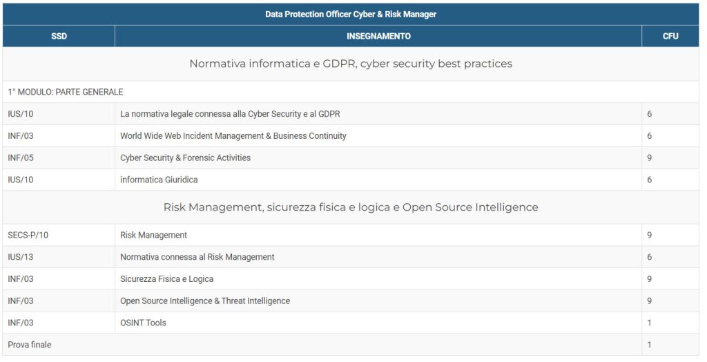 La conoscenza diffusa della minaccia informatica e la crescente richiesta di qualifiche DPO Data Protection Officer e Cyber Risk Manager ( figure in grado di prevenire e gestire gli incidenti informatici e il processo di Business Continuity di un azienda ) alle quali viene aggiunto la formazione di Risk Manager per un percorso formativo che comporti la padronanza delle metodiche di analisi , gestione e prevenzione del rischio generale e di quello informatico cosi come la moderna gestione delle aziende, anche ai sensi della normativa 231 e di quella che il 261 GDPR prevede e richiede.